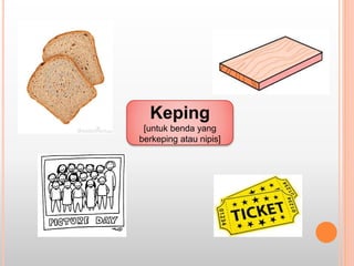Keping Benda yang rata nipis pipih lebar serta leper seperti roti gambar papan poskad biskut marmar dan sebagainya. Latihan tulis penjodoh bilangan yang sesuai. Keping 2 kepul 1 ketul 1 kuntum 1 lingkar 1 naskhah 1 orang 1.